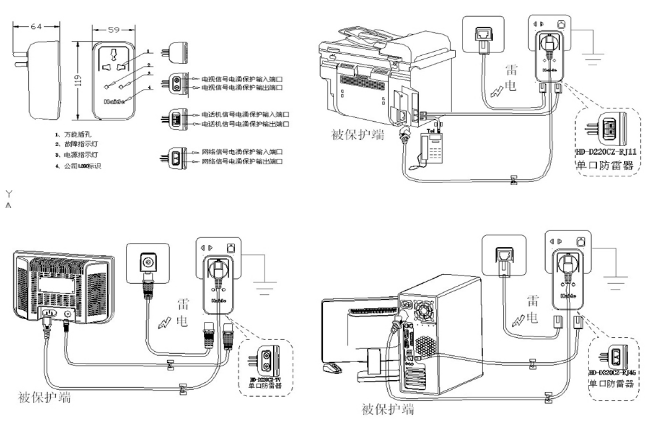 避雷器先插入供電插座,用電設(shè)備再從避雷器插孔取電,請確保墻壁插座的地線有良好的接地(推薦接地電阻≤4Ω)。