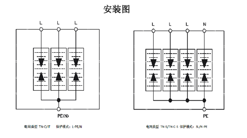 電源相線(L)、零線(N)分別接入電涌保護(hù)器相應(yīng)接線端子,保證牢固及可靠,將避雷器接地端與防雷地線(推薦接地電阻≤4Ω)作良好電氣連接。