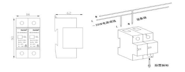 電源相線(L)、零線(N)分別接入電涌保護器相應(yīng)接線端子,保證牢固及可靠,將避雷器接地端與防雷地線(推薦接地電阻≤4Ω)作良好電氣連接。