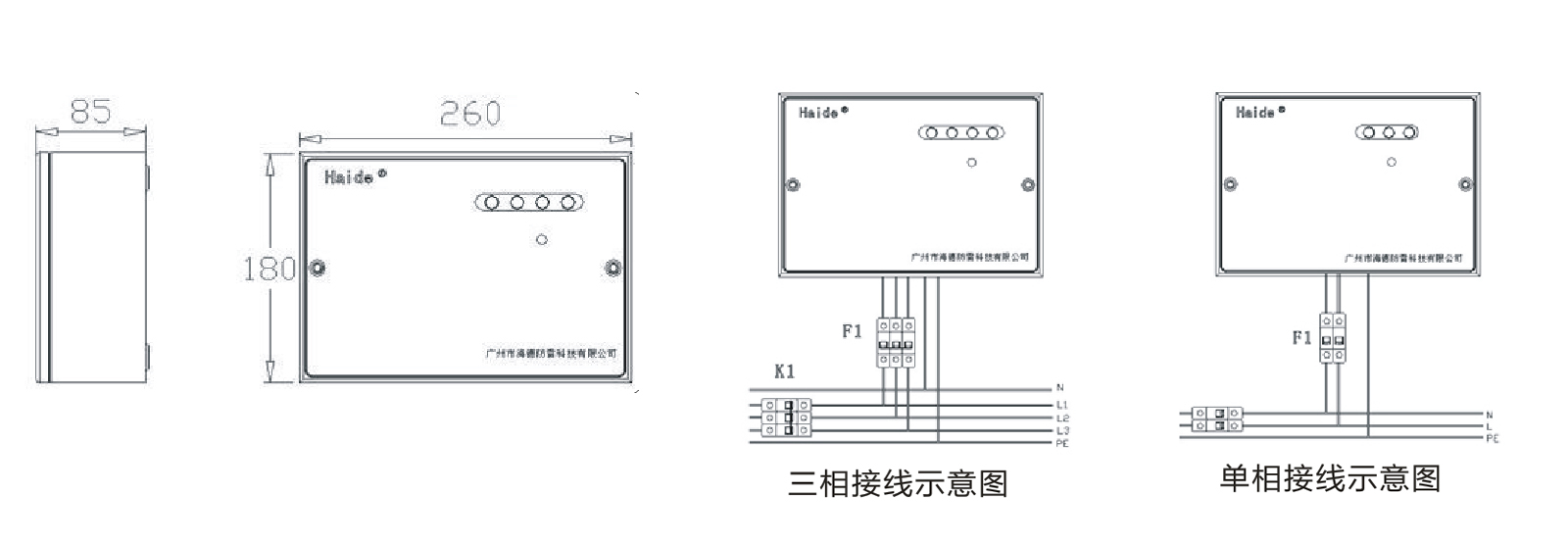 電源相線(L)、零線(N)分別接入電涌保護(hù)器相應(yīng)接線端子,保證牢固及可靠,將避雷器接地端與防雷地線(推薦接地電阻≤4Ω)作良好電氣連接。