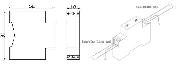 The phase line (L)(+) and zero line (N)(-) of the power supply are respectively connected with the corresponding terminals of the surge protection device, and the firmness and reliability shall be ensured; the grounding end and the lightning protection ground wires (preferred the grounding resistance≤4Ω) of the lightning arrester are given good electric connection.